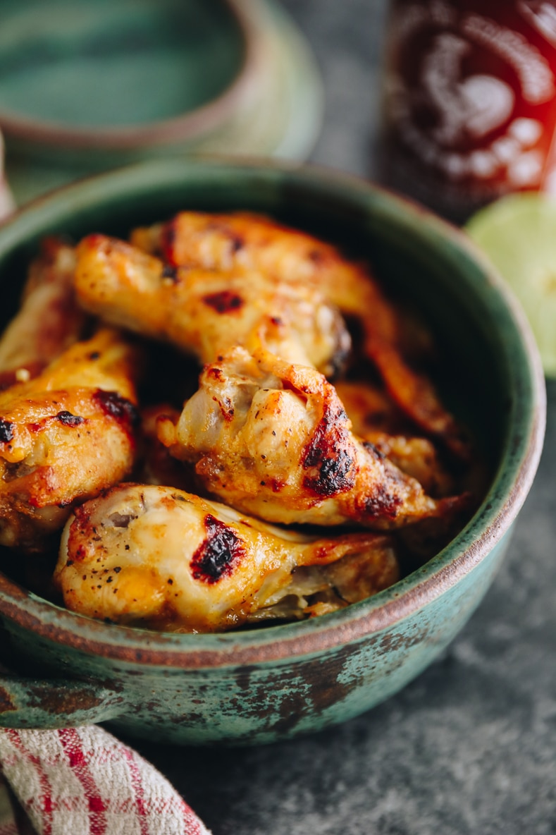 That being said, the game food I can get down with! Wings, nachos, fries…sign me up! I’m all about that football foodie life. These baked sriracha lime chicken wings are not exception. Thankfully I don’t need a football game to give me permission to eat these. Just an average Tuesday night and some wings and I’m a happy girl. These babies are baked too keeping them healthy!