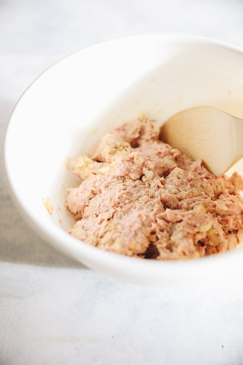 STEP 1: Combine the turkey, chopped onion, breadcrumbs, egg, Italian seasoning and salt and pepper in a large bowl and mix with your hands.Â
