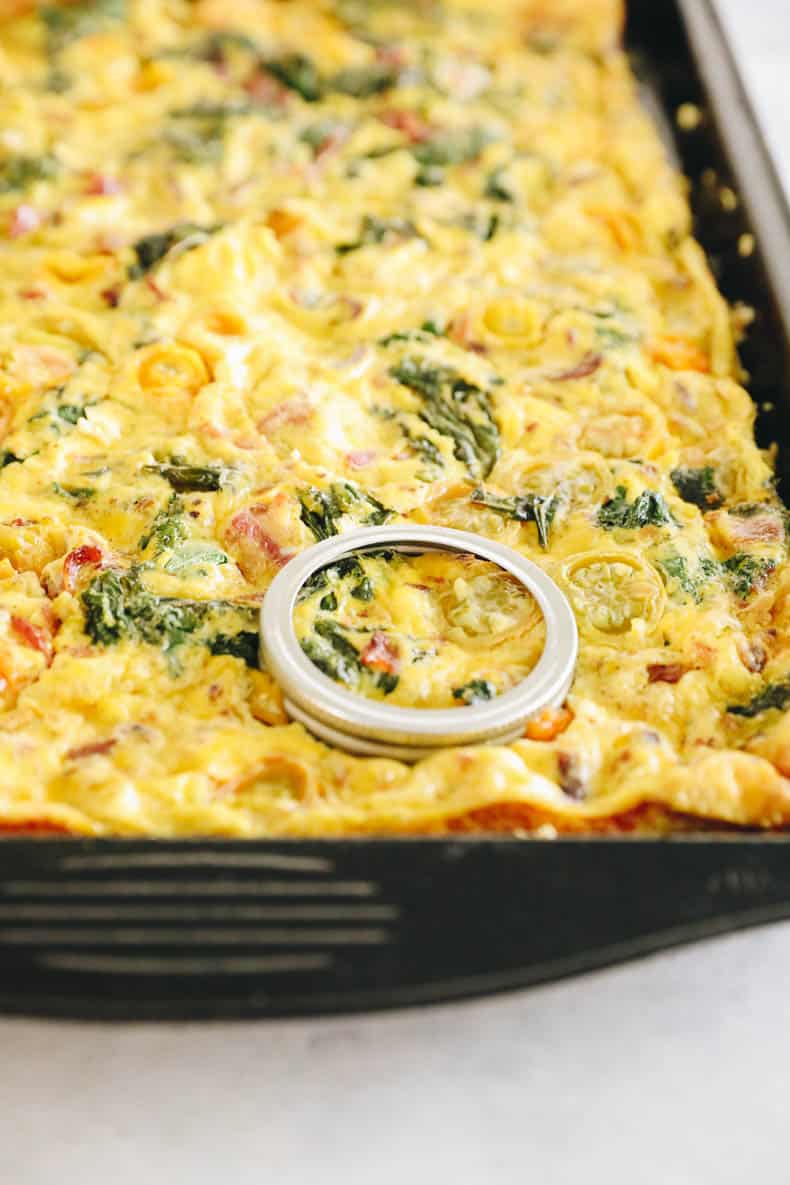 - Pour egg mixture onto sheet pan and cook for 15-20 minutes or until eggs have fully set.