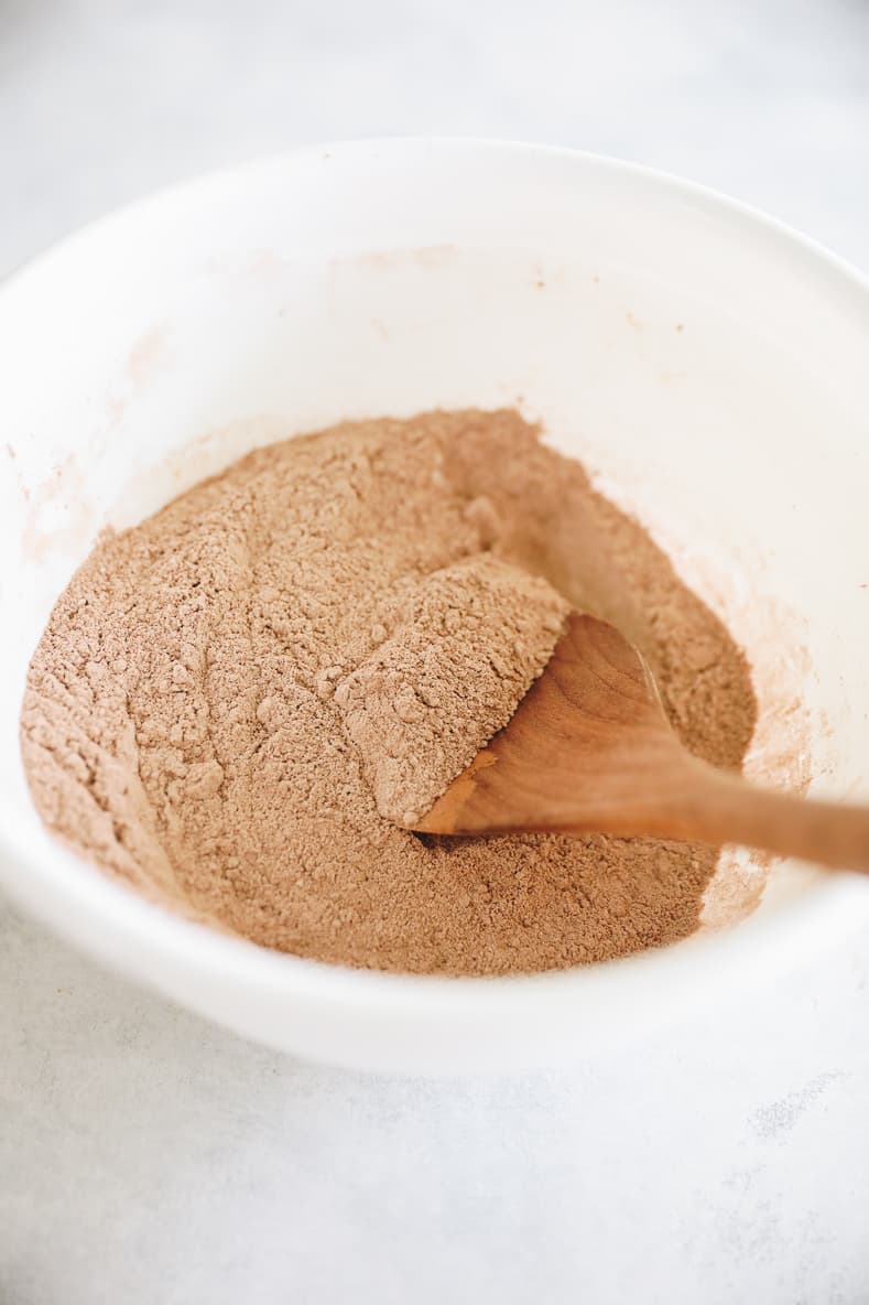 In a large bowl combine white flour, whole wheat flour, cocoa powder, baking soda and salt.