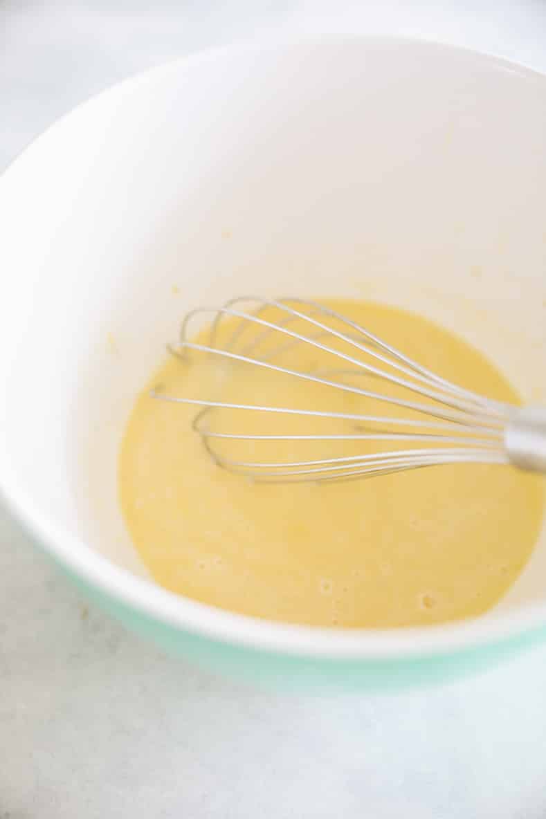 - In a separate bowl whisk together butter, honey or maple syrup, applesauce, egg, almond milk and vanilla.