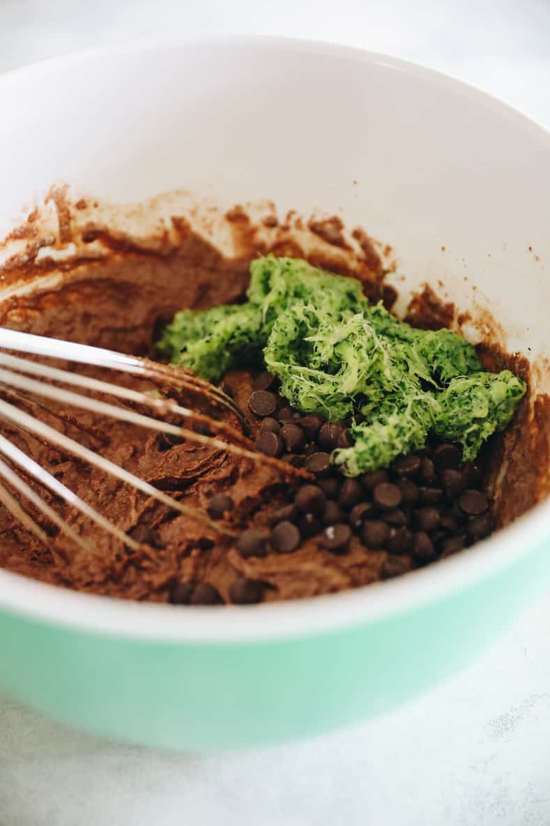 - Slowly incorporate dry mix into wet. Stir in shredded zucchini and chocolate chips.