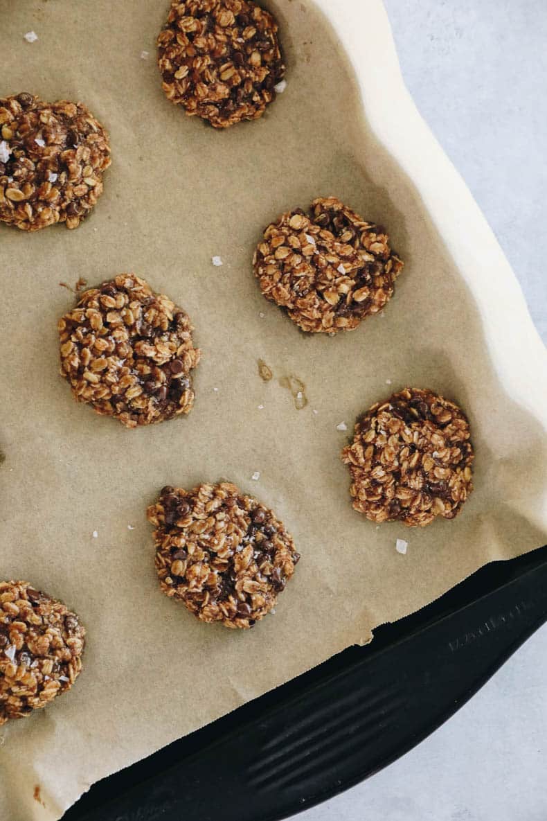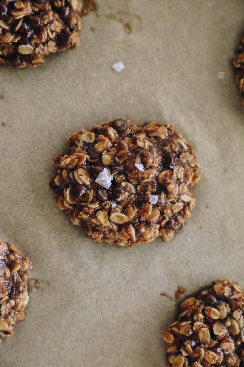 Using your hands or a cookie scoop roll out 12 golf-ball sized balls and place onto lined baking sheet. Flatten cookies slightly with the palm of your hands (pro tip: wet your hands or cookie scoop slightly so that batter doesn’t stick to your hands or scoop). Bake for 10-12 minutes or until edges are golden brown and inside is still gooey. You want the inside to still look a little raw so they stay chewy. Don’t worry – they’re vegan! Sprinkle cookies with flaky sea salt and let sit on the baking sheet for 10 minutes.