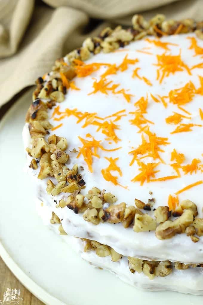 This Gluten-Free Carrot Cake with lightened-up cream cheese frosting is a delicious and healthy alternative for your next birthday cake or party.