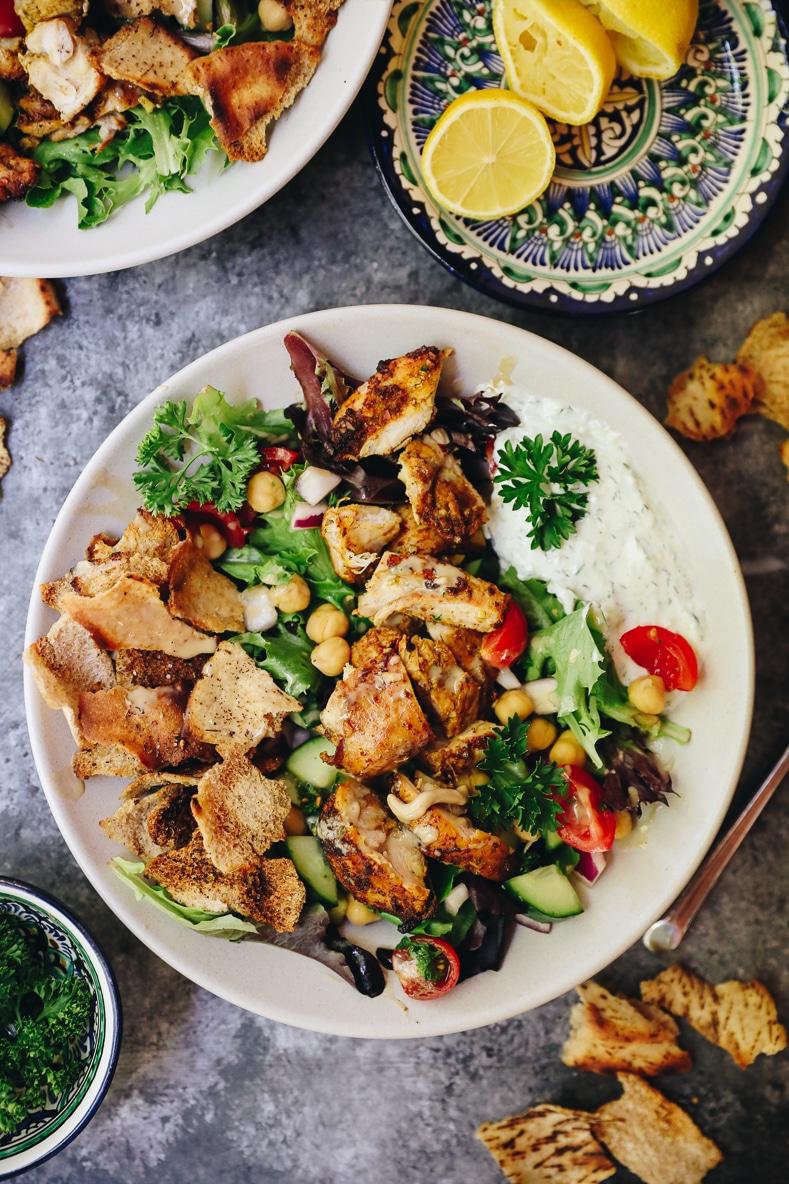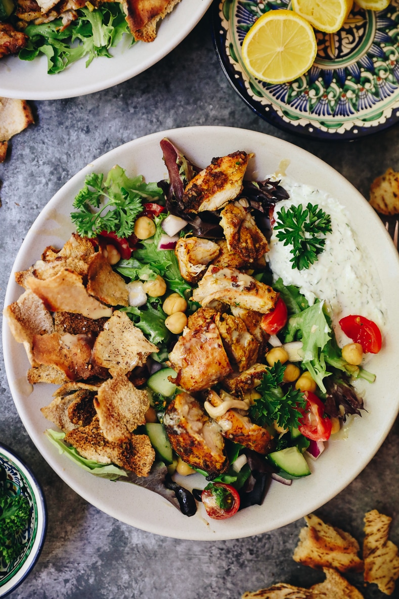 - To assemble bowls divide baby greens into 4 bowls. Top with veggie-chickpea salad and divide chicken, pita chips and tzatziki onto each bowl.