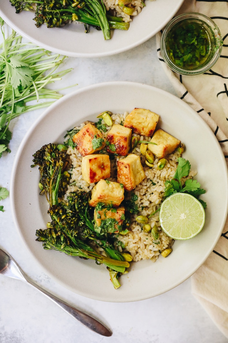- Divide rice between 4 bowls and top evenly with tofu and broccolini. Drizzle with remaining sauce and sprinkle with pistachios or other nuts and seeds for crunch.
