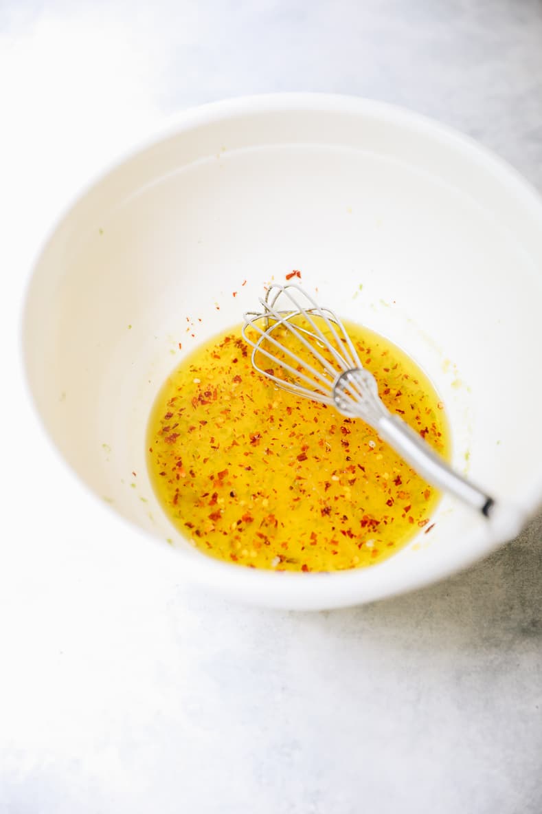 - Combine olive oil, lime zest, lime juice, maple syrup, garlic powder, red pepper flakes and salt together in a large bowl.