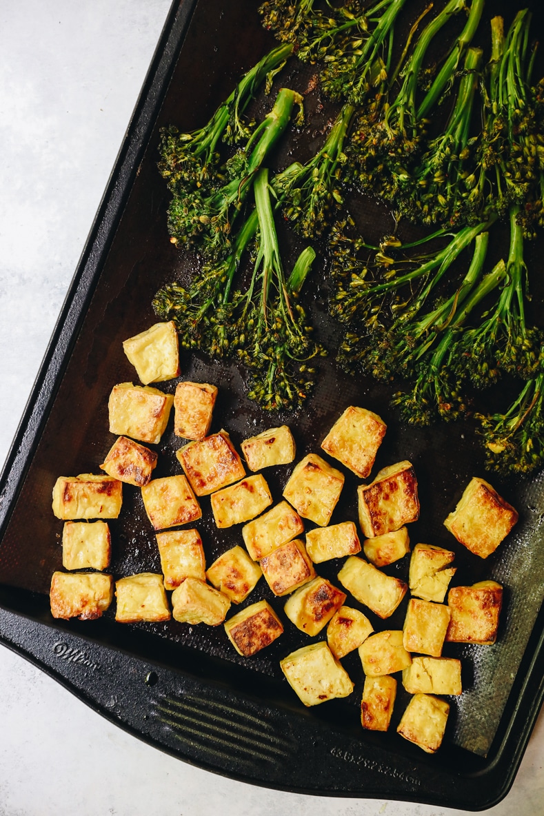 - Bake tofu + broccolini for 15 minutes or until edges of broccolini are crisp and tofu is golden brown.