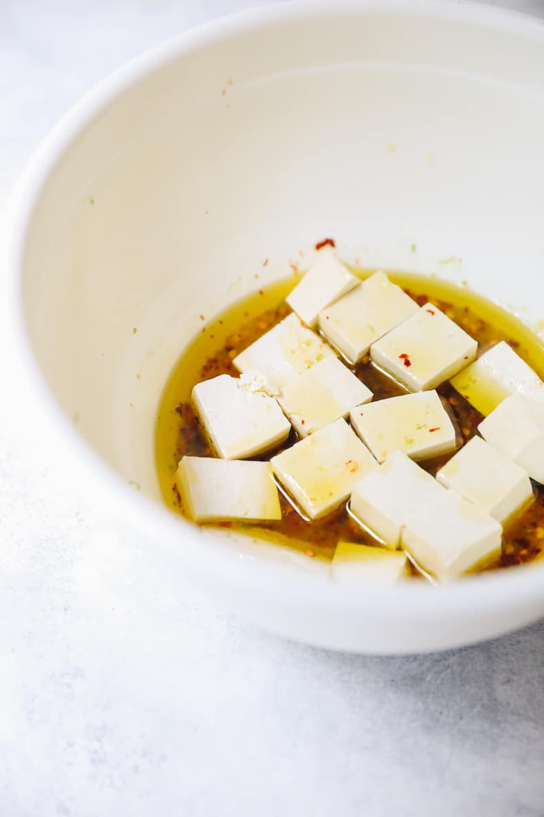 - Press tofu to remove extra water and then chop into 1 inch cubes.