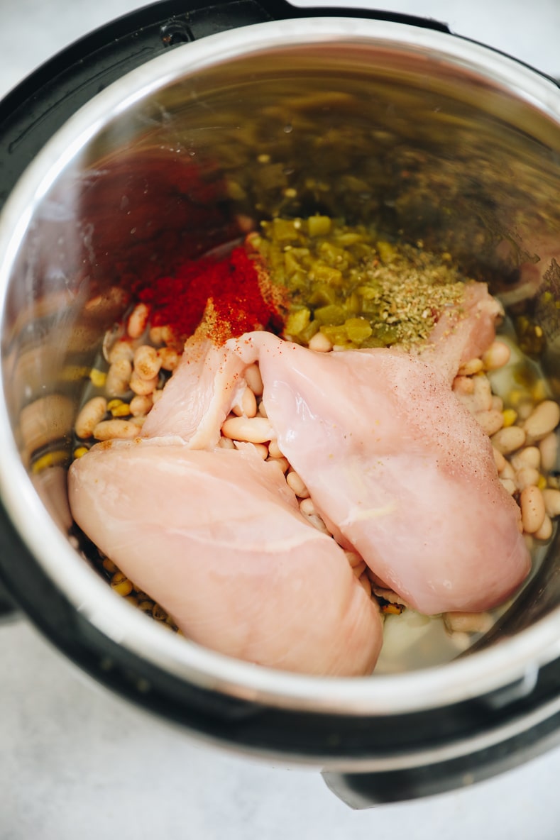 - Add the following ingredients to your Instant Pot in this order: onion, garlic, white beans, green chilis, corn kernels and top with chicken.