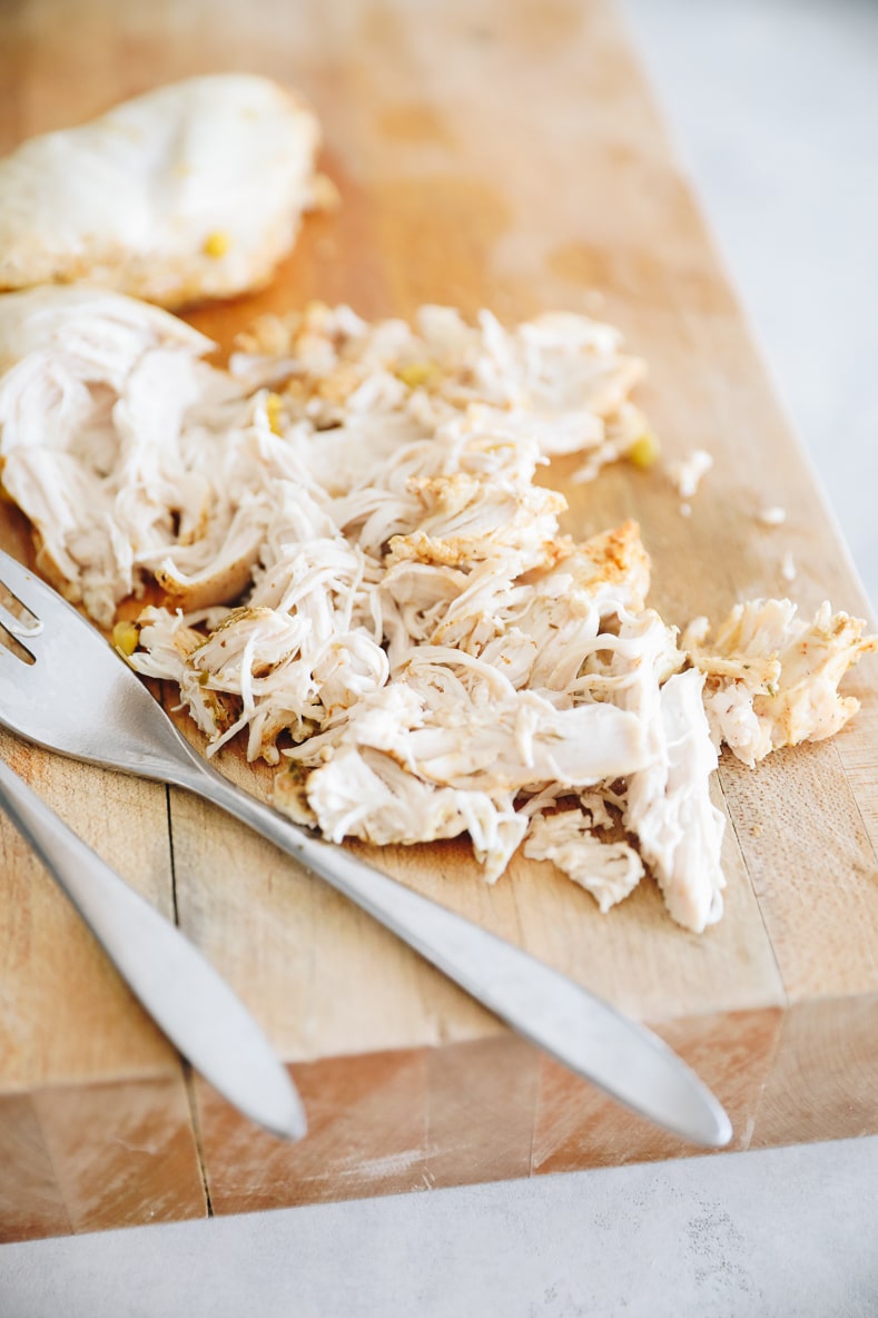 - On a cutting board use two forks to shred chicken into bite-sized pieces.