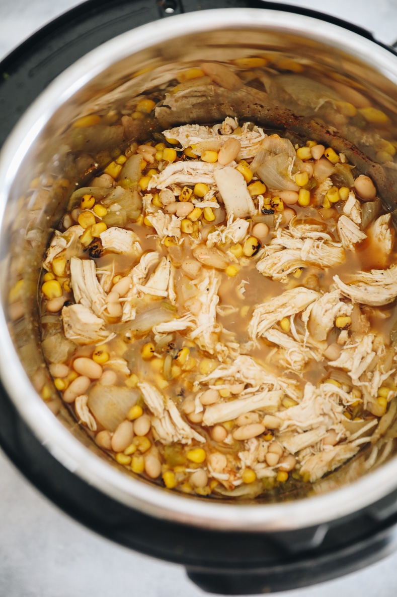 Add the following ingredients to your Instant Pot in this order: onion, garlic, white beans, green chilis, corn kernels and top with chicken. Pour chicken broth over top and stir in spices Seal lid and clove valve. Set Instant Pot to pressure cook on high for 10 minutes.