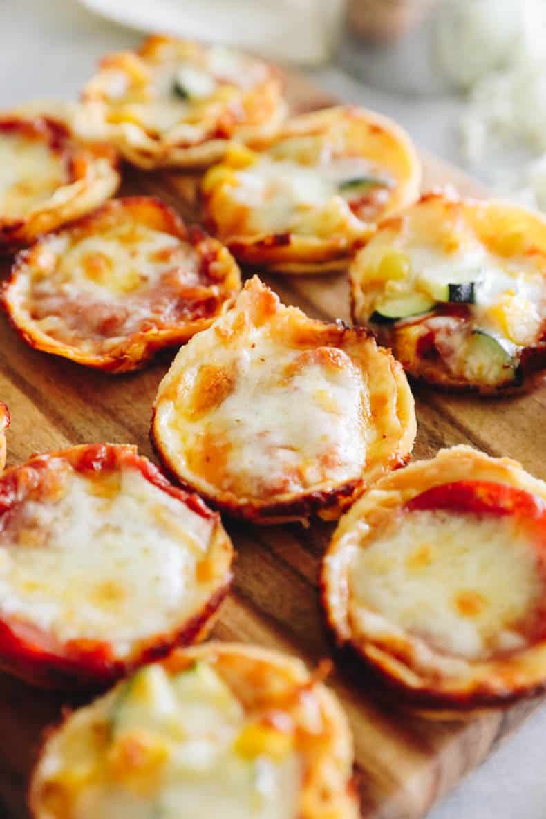 These Mini Tortilla Pizza Cups fit that rule too! They’re basically a mini version of my tortilla pizza recipe but baked in a muffin tin. I mean everything is better when it’s miniature, right?!