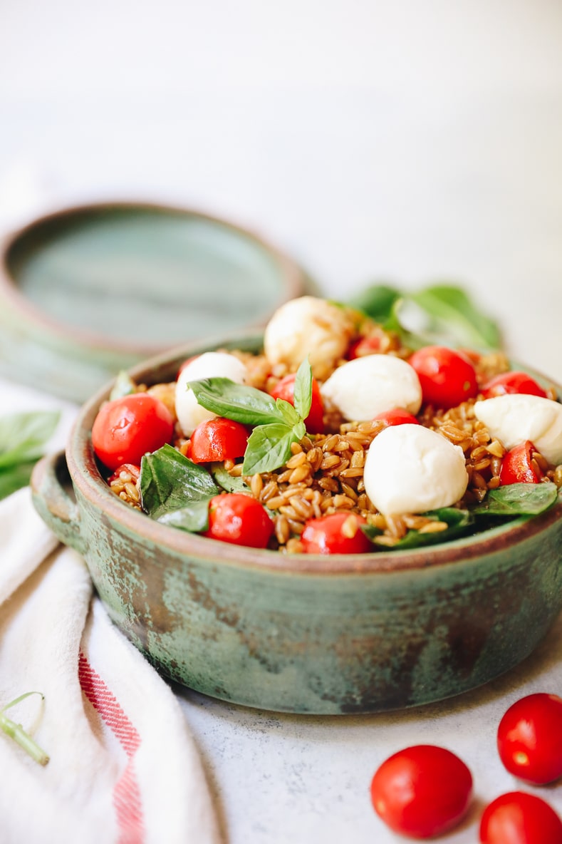 I’m anxiously awaiting my cherry tomatoes to come in to make this farro caprese salad. I’ve been picking up tomatoes from the farmer’s market but man am I excited to make this with my homegrown tomatoes. I’ve got a few babies coming in that should be ripe in the next week or two. We have three tomato plants and while my patience is waning, I know in a few weeks I’m going to have wayyyyy too many tomatoes on my hands to know what to do with. So far I’ve got my pacifica salad, summer panzanella salad and now this farro caprese salad on the list!