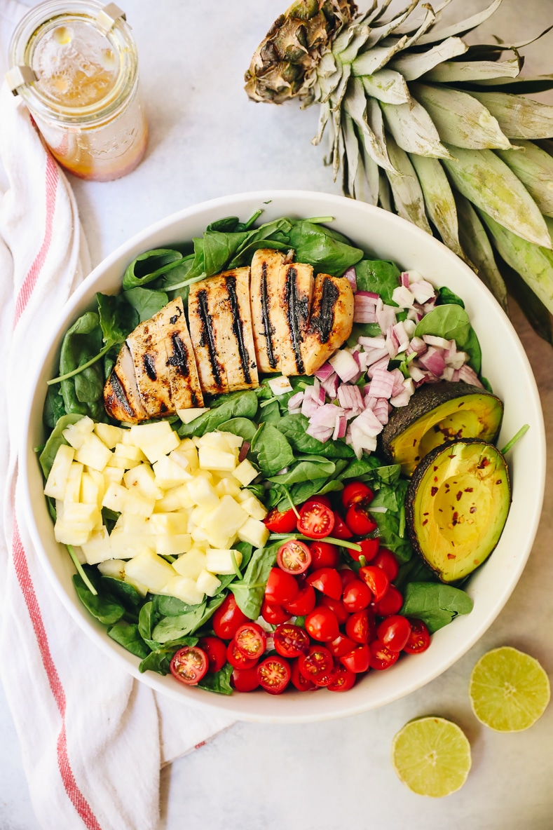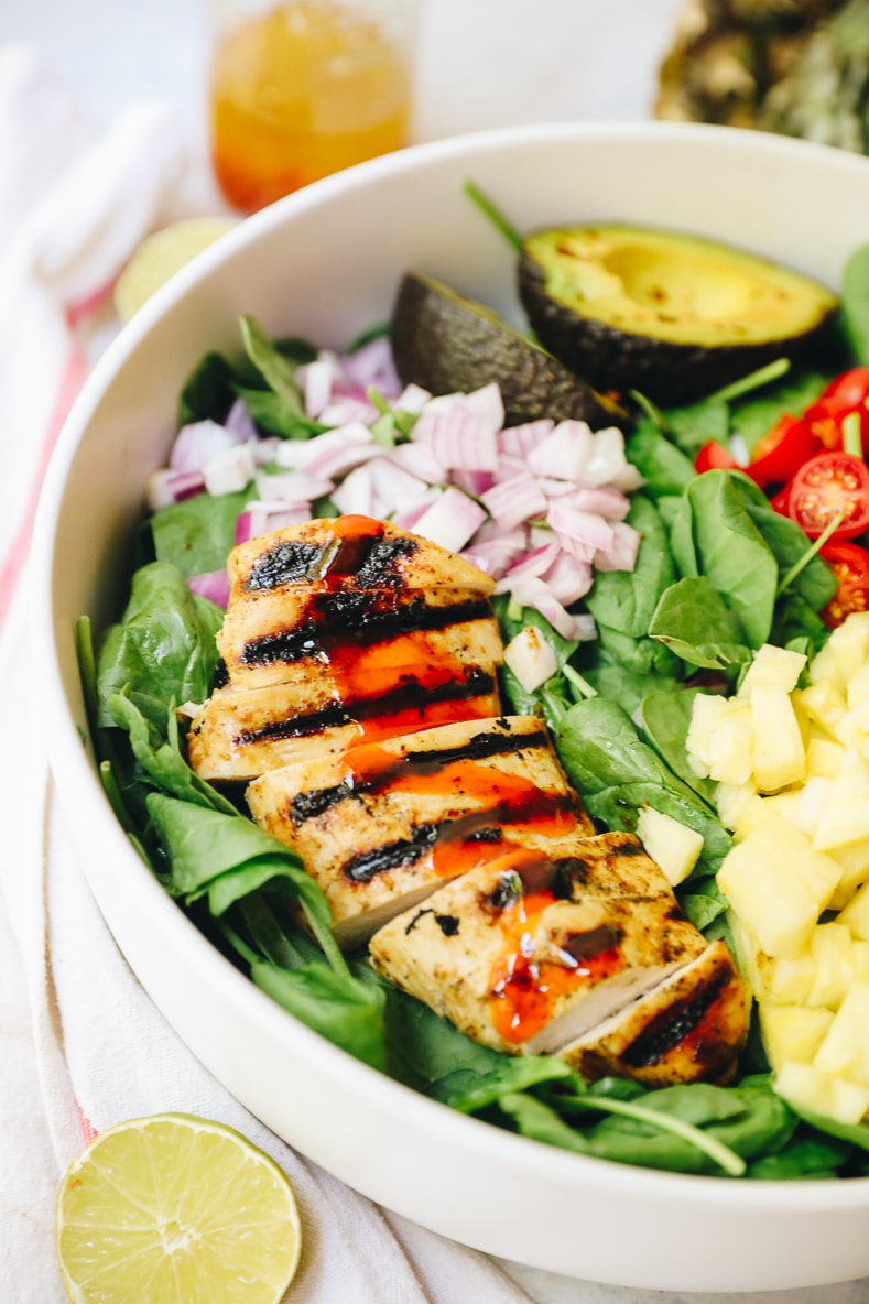 The chicken is marinated in a sriracha-pineapple mixture and the salad dressing has even more kick with additional sriracha and lots of lime juice! The avocado won’t brown thanks to all of that lime juice but don’t worry, the fresh pineapple helps to cut some of the sourness. It was surprisingly easy to make and it’s packed-full of vegetables.