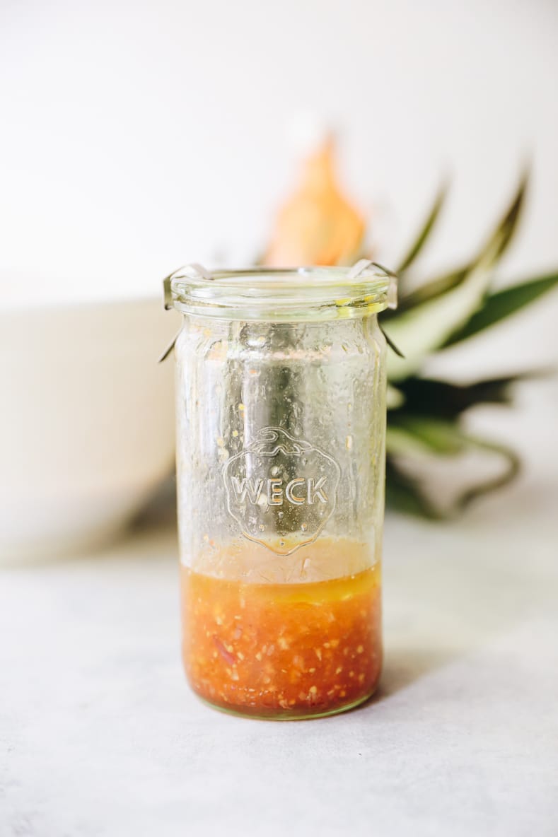 LAYER 1: Divide the dressing evenly between two large mason jars. Put the dressing at the bottom of the jar to make sure it doesn’t change the consistency of the rest of the ingredients.