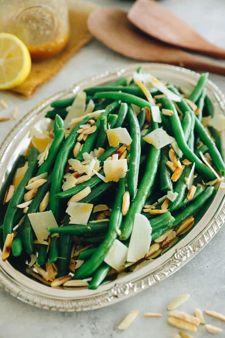 - Add your green beans, toasted almond and parmesan cheese to a large plate or bowl and set aside.