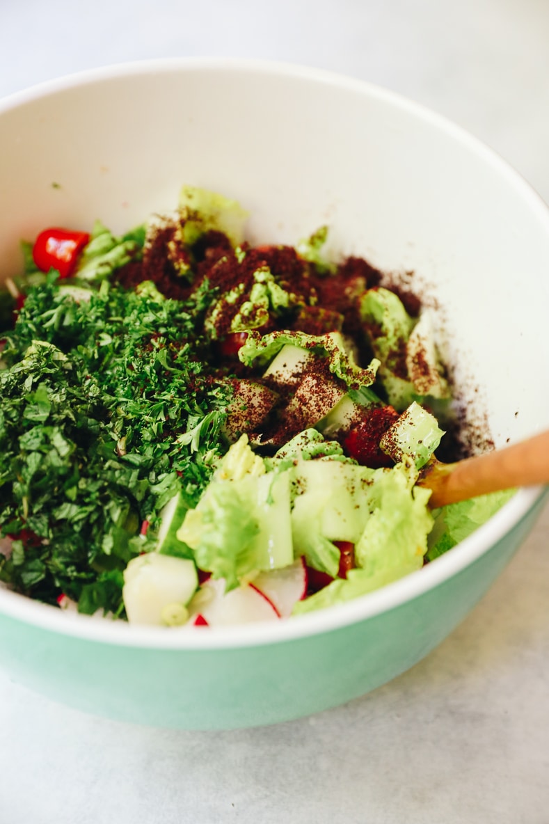 - Meanwhile, combine all chopped veggies in a large bowl (cherry tomatoes, cucumber, romaine, radishes, scallions, parsley + mint). Stir well.