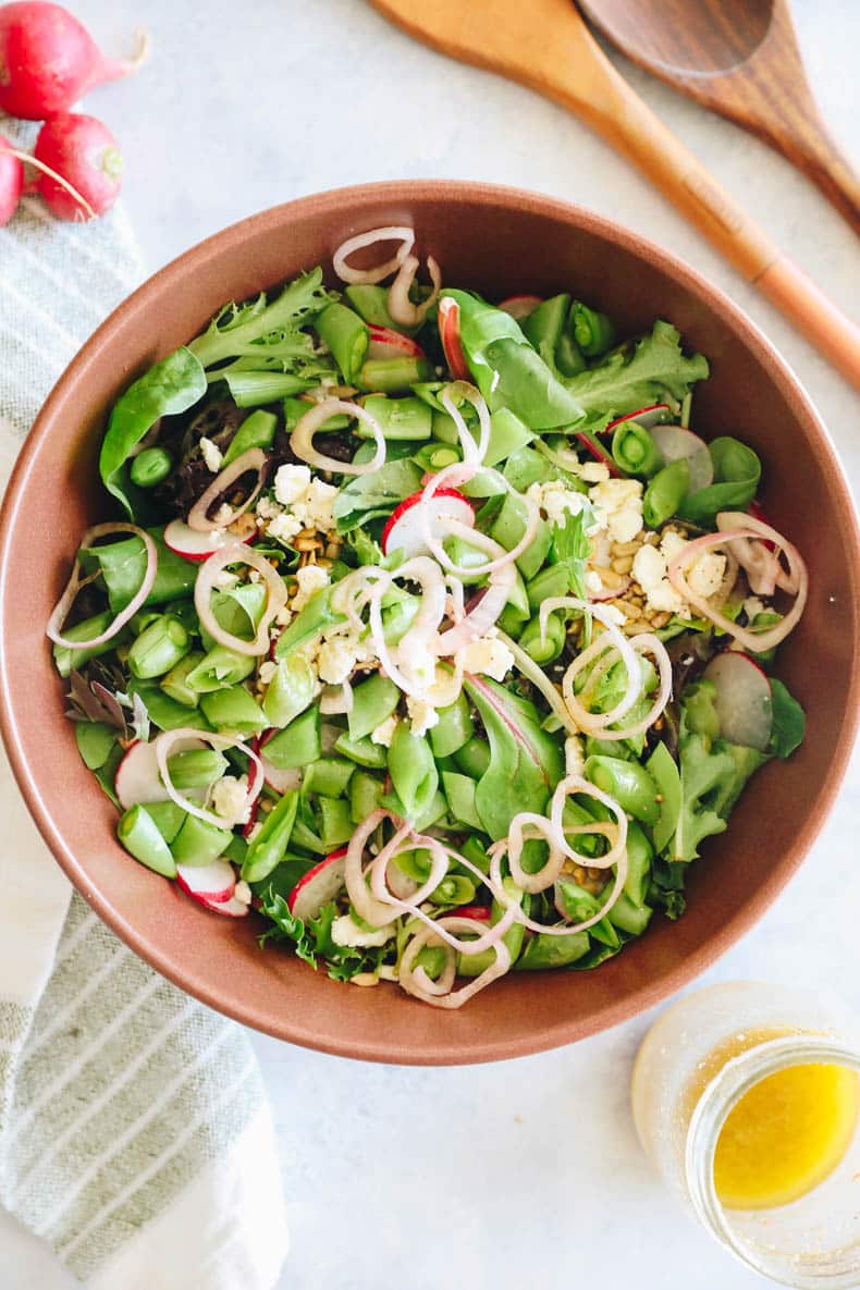This easy spring mix salad recipe is made with fresh spring baby greens, crunchy radishes and a tangy pickled shallot vinaigrette. Topped with toasted sunflower seeds and feta this salad recipe is sure to be a favorite side dish or main entree that everyone will love.