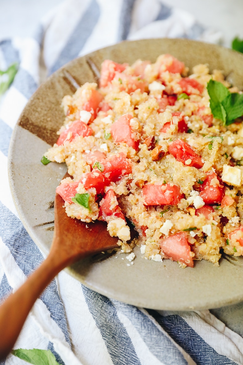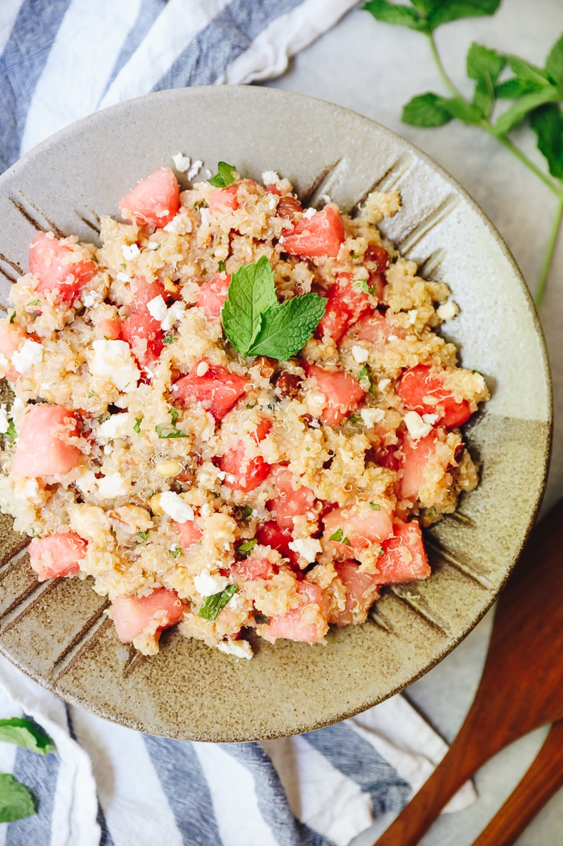 Traditional watermelon salads are just watermelon, feta and mint but I wanted to add a protein and fiber boost andย love the addition of cooked quinoa! Toss in a simple olive oil dressing and you have a refreshing salad for summer!