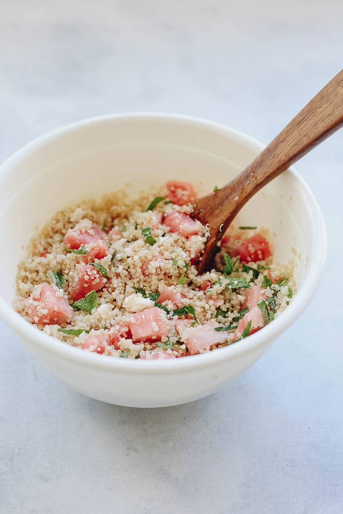 - In a large bowl combine quinoa, watermelon, mint, and feta cheese. Stir to combine.
