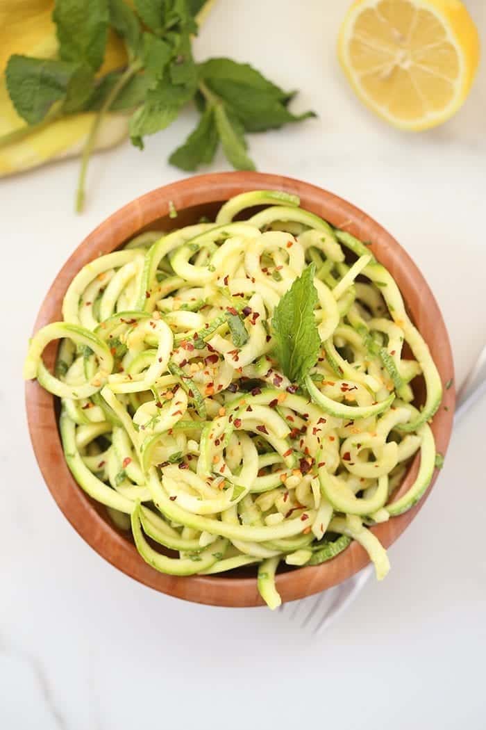 Fresh zucchini noodle salad topped with mint and red pepper flakes.