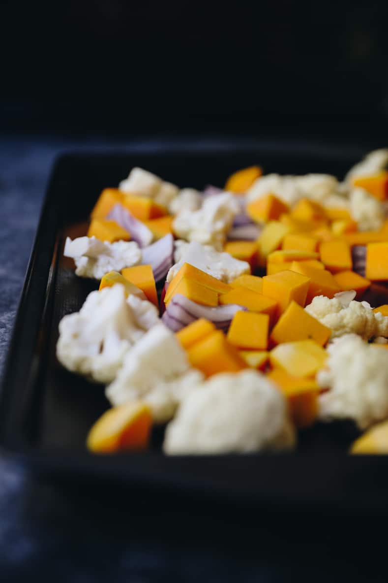 - chopped vegetables – the more colorful the vegetable, the prettier this dish is! I used butternut squash, red onion and cauliflower but you can truly use whatever you want. Some ideas: broccoli, squash, zucchini, carrots, mushrooms etc..