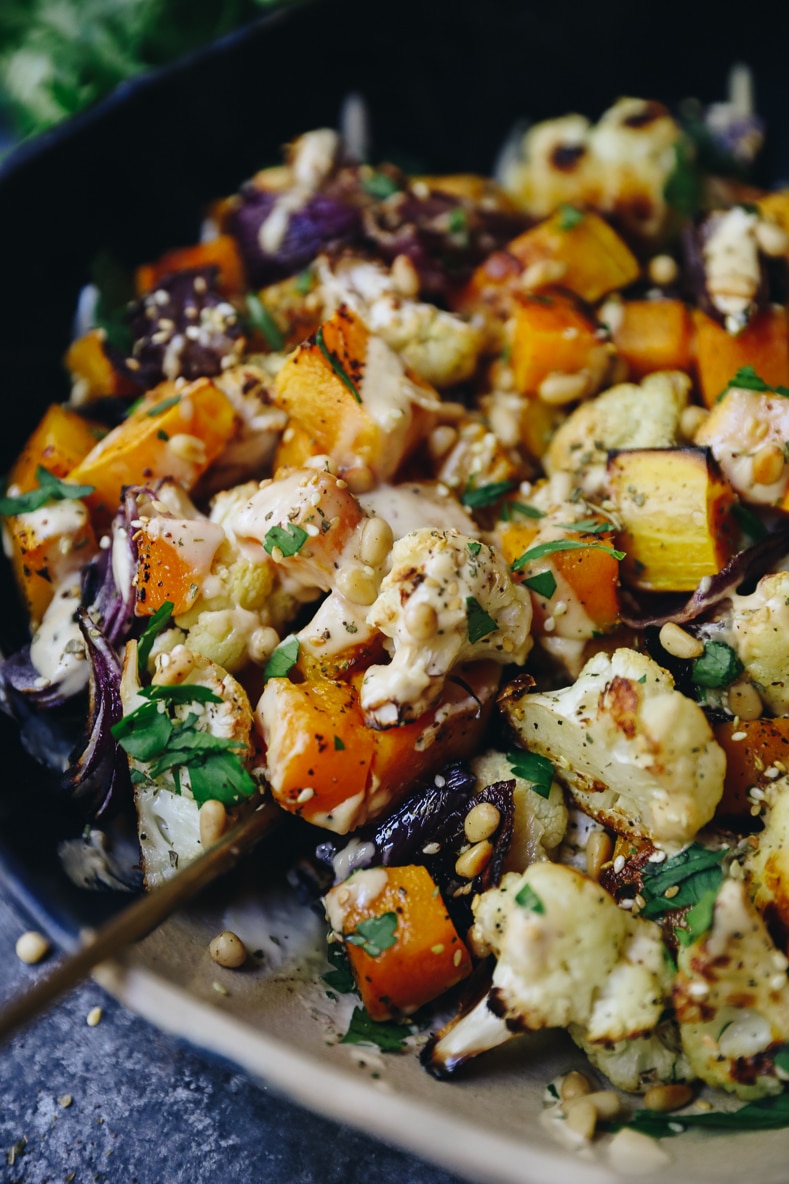 - When vegetables are done drizzle with tahini mix and top with pine nuts, za’atar and parsley.