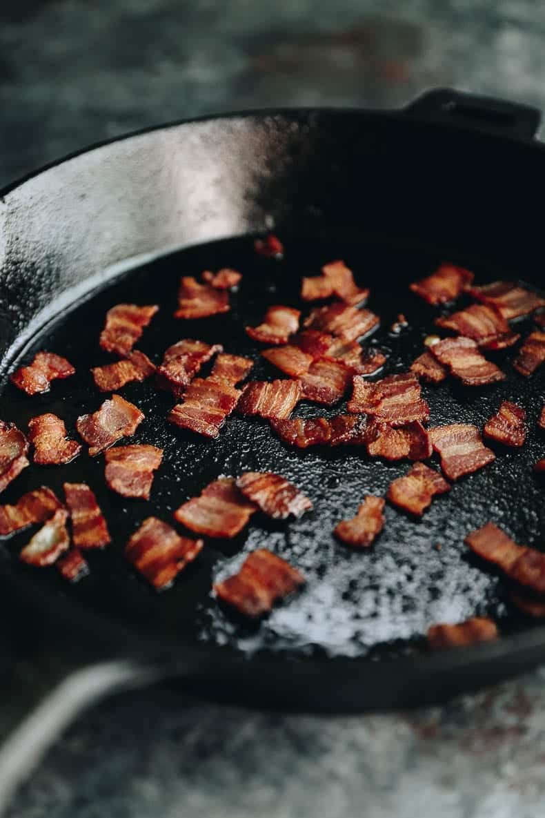 - Chop the bacon into bite size pieces and cook in a cast iron pan over medium high heat until you have crispy bacon pieces. Remove the crispy bacon pieces and place on a towel lined plate. Pour the bacon fat into a small bowl or jar and set aside. *see note above for cooking bacon in the oven