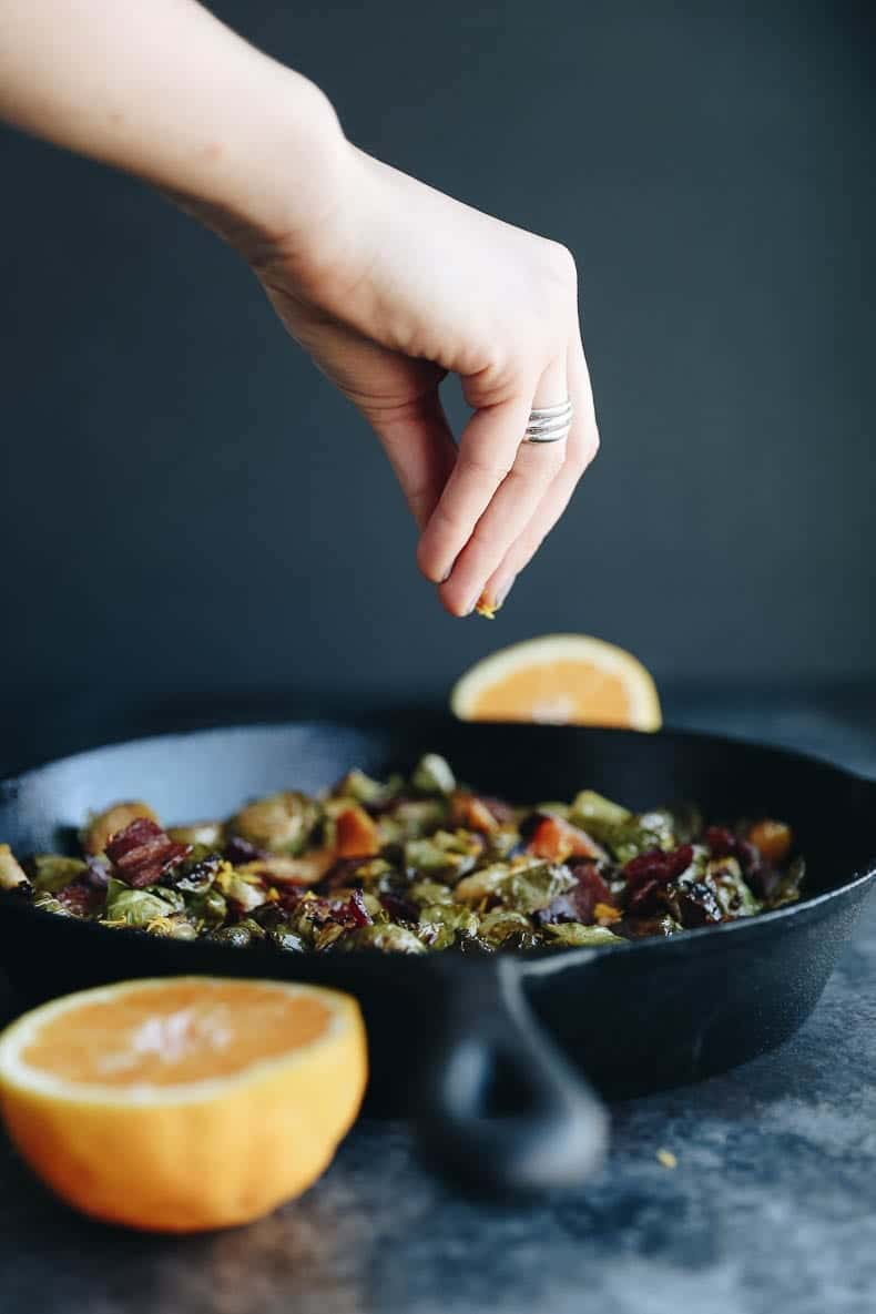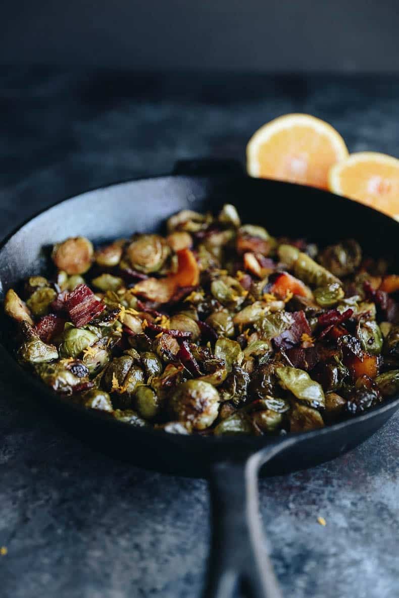 You can still make these brussels sprouts if you donโt have a cast iron skillet. Start by cooking your slices bacon in the oven with this easy tutorial. After the bacon is roasted, spread the brussels sprout mixture on a rimmed baking sheet and cook for the same amount of time as listed above. Finish with the orange zest, red wine vinegar and bacon and youโve got a delicious side my entirely in the oven.ย