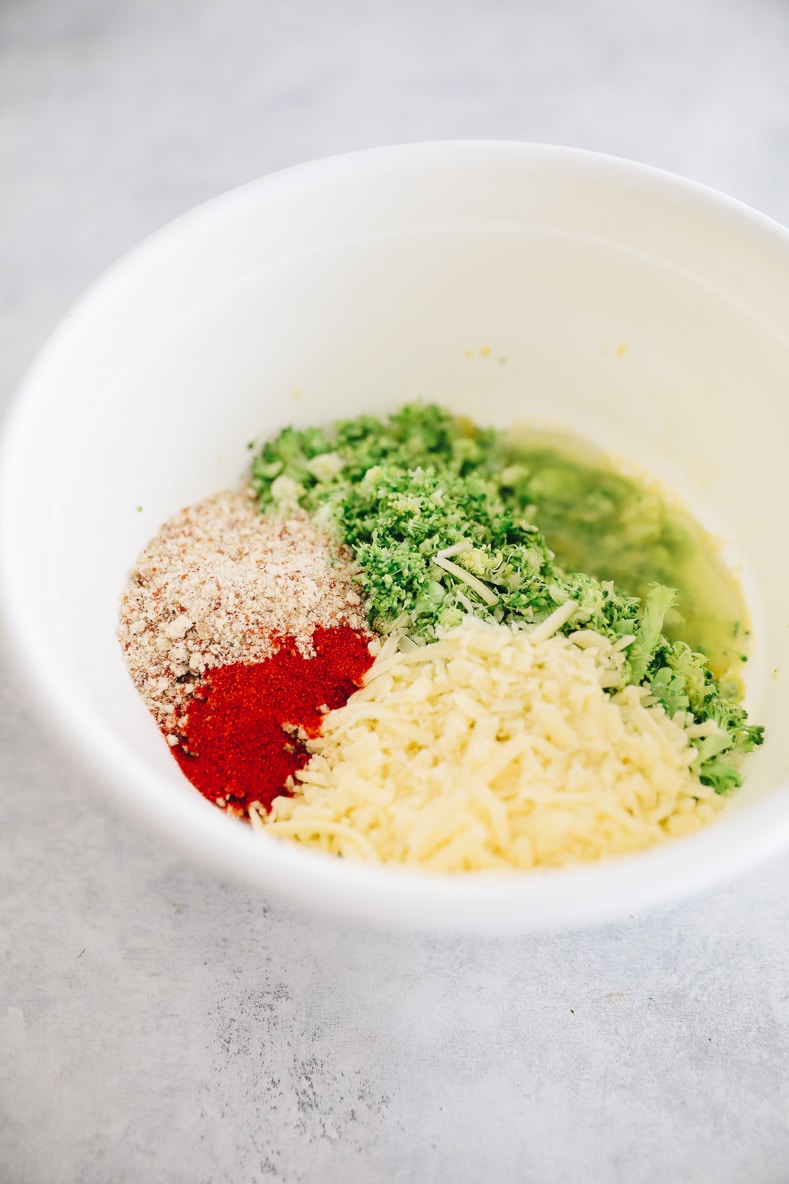 - In a large bowl combine chopped up broccoli with all other ingredients (except oil). Stir to combine.