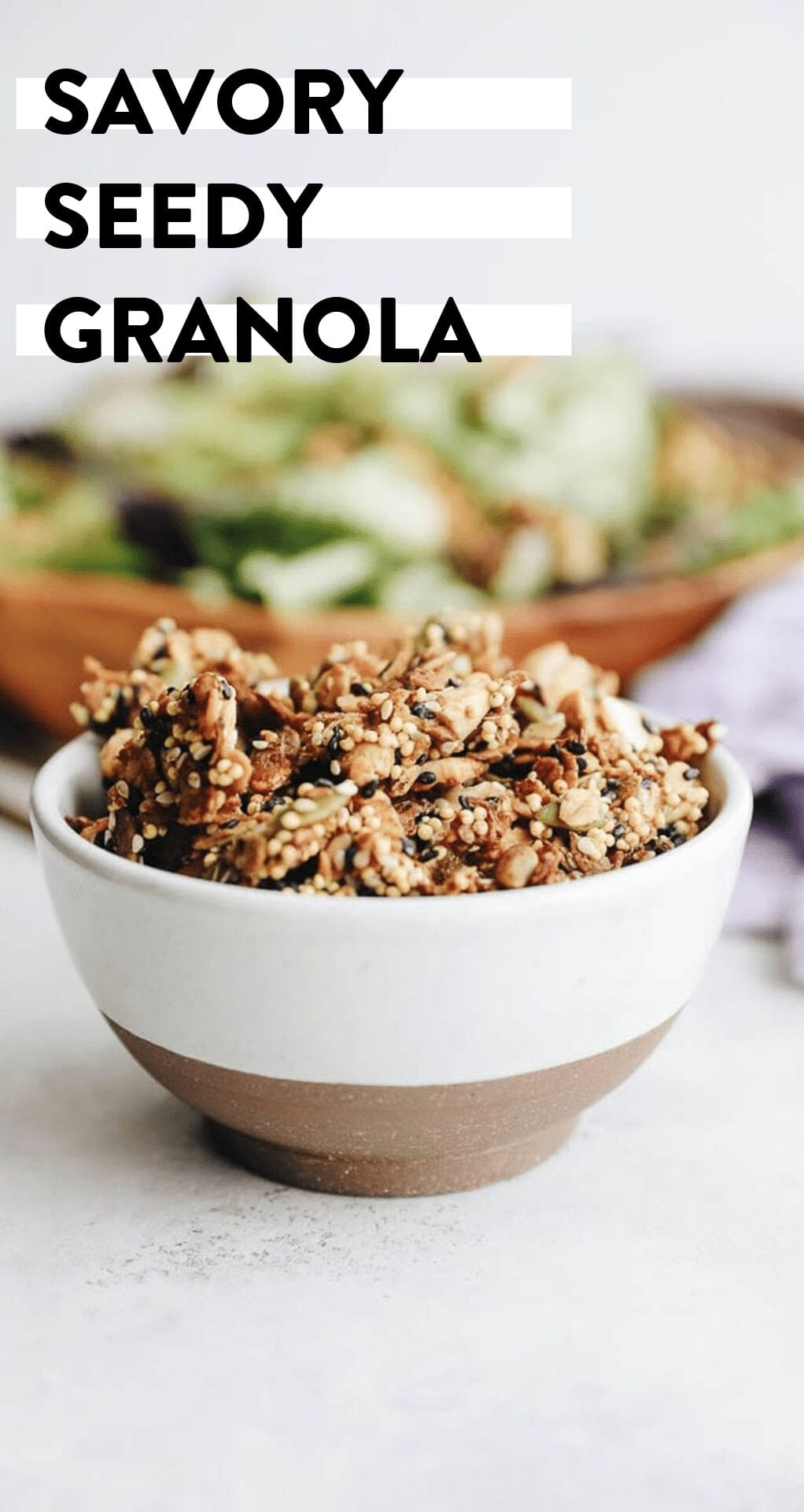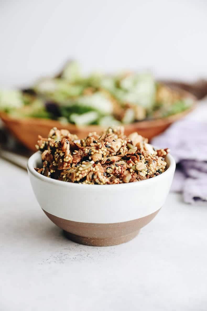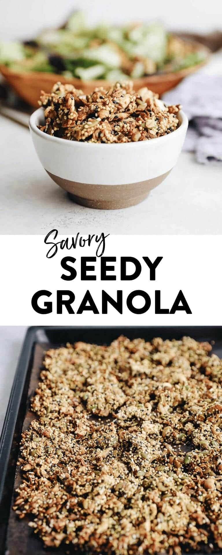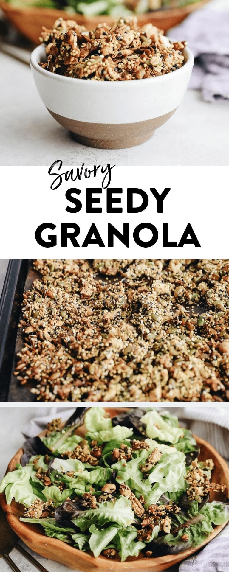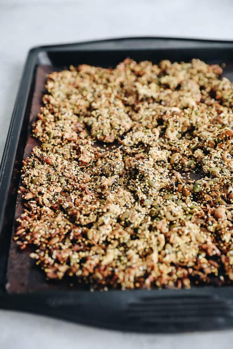 You might be thinking, “Sure, savory granola sounds great but what the heck do I eat it with?” Honestly, I think you can eat this savory seedy granola pretty much the same way you would eat sweet granola. Eat it by the handful or enjoy with yogurt (I would stick with plain yogurt) for a savory parfait. But this recipe also tastes delicious sprinkled onto savory dishes and for an added nutrition boost onto a salad.