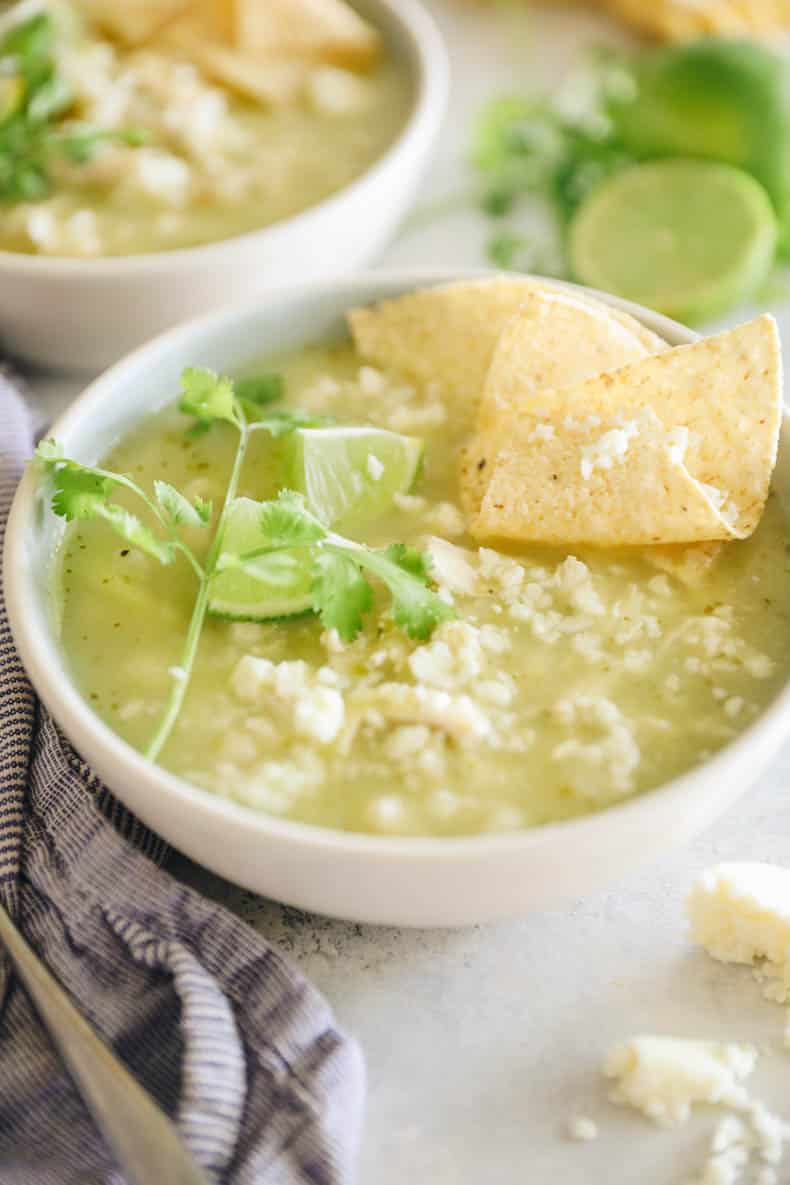 This chicken pozole is a take on traditional Mexican stew with a spicy twist. Featuring white hominy, tomatillos, cilantro and green chiles this green pozole makes for a delicious weeknight soup or weekend delight.