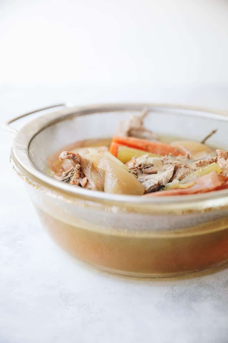 STEP 2: Pour broth through a fine mesh strainer or cheese cloth. The finer the better to catch all particles. Make sure strainer is over a large bowl to catch the broth.