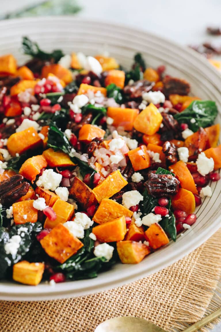 Celebrate fall with this delicious and beautiful butternut squash salad! Made with roasted butternut squash, kale, pomegranate seeds, candied pecans, feta cheese in a delicious apple cider vinegar dressing this recipe makes the perfect fall salad or Thanksgiving side!