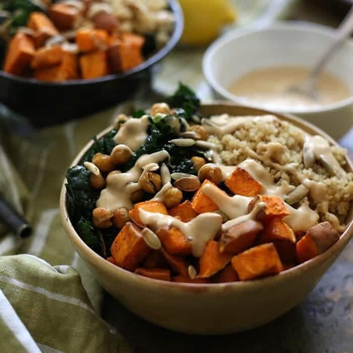 An easy, go-to vegetarian dinner recipe for Macro Veggie Bowls. Made with sweet potato, quinoa, crunchy chickpeas and greens topped with a tahini dressing, this dinner recipe will quickly become a staple at your healthy dinner table.