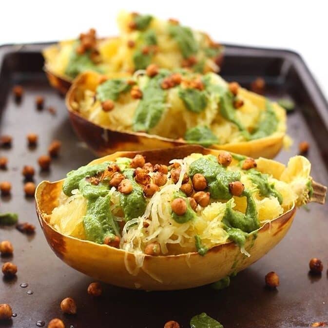 Swap the pasta for a low-carb alternative in this Pesto Spaghetti Squash with Spicy Roasted Chickpeas recipe!  This vegetarian dinner is high in fibre, protein and certainly not lacking on flavor!