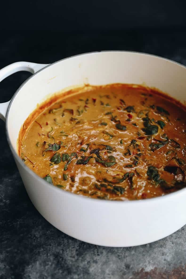 - Add the spices and curry paste to the pot and continue to cook for another 5 minutes. Season with salt.