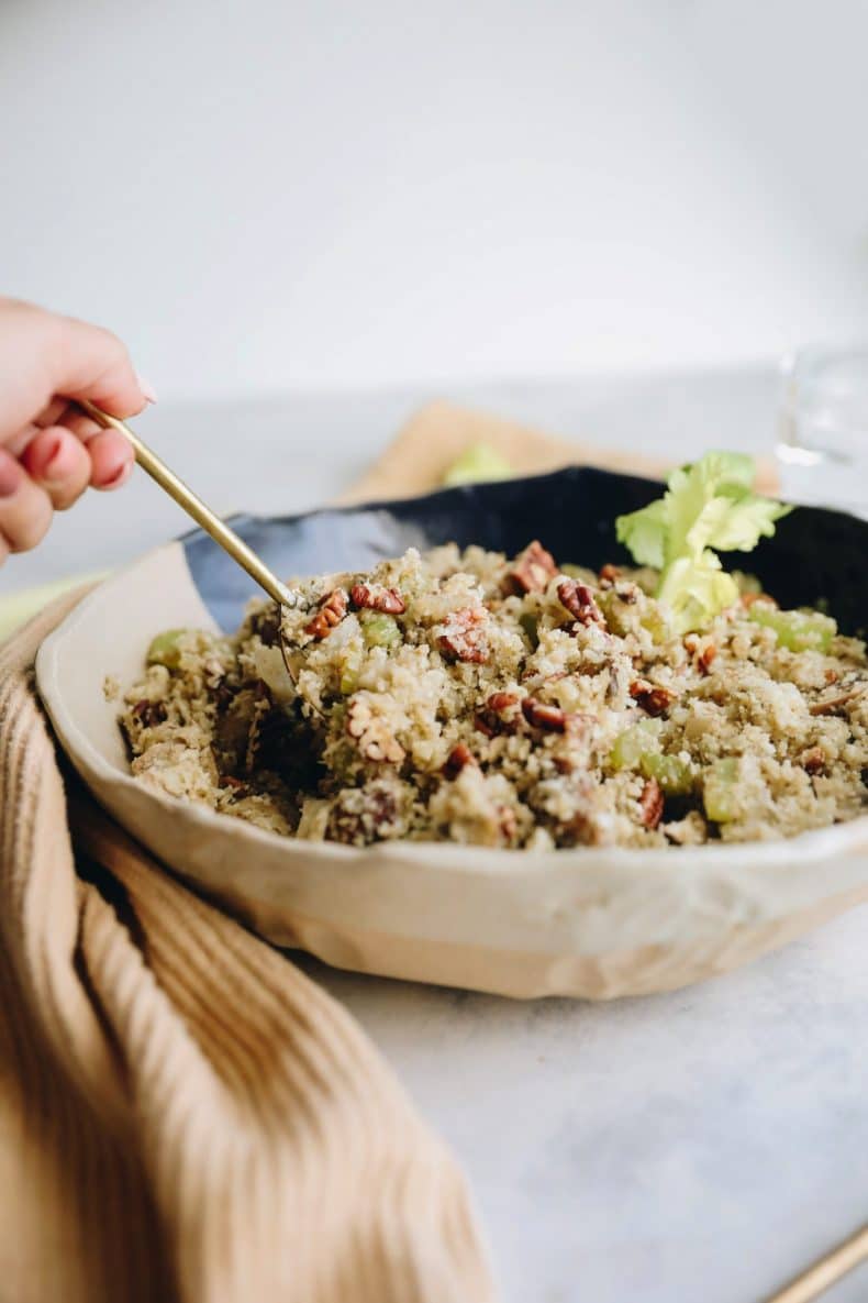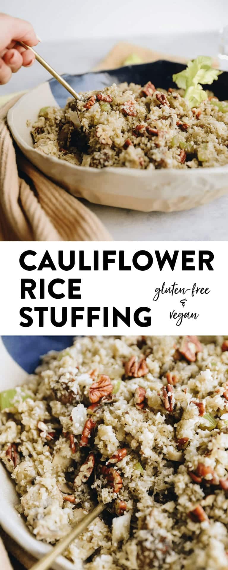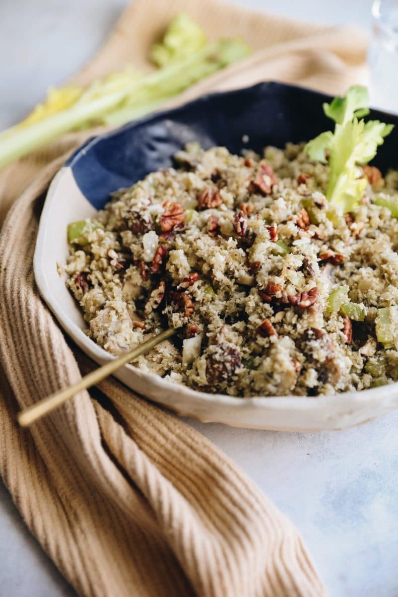 Sitting here on a casual Tuesday eating my cauliflower stuffing feels kind of liberating. We all save stuffing for once (maybe twice) a year, since it’s basically the opposite of nutritious. But hot damn is it delicious. It also feels good knowing that people who make a different choice than I do when it comes to their food decisions can also enjoy this cauliflower stuffing. And this is coming from a bread lover – so you know this stuffing is good!