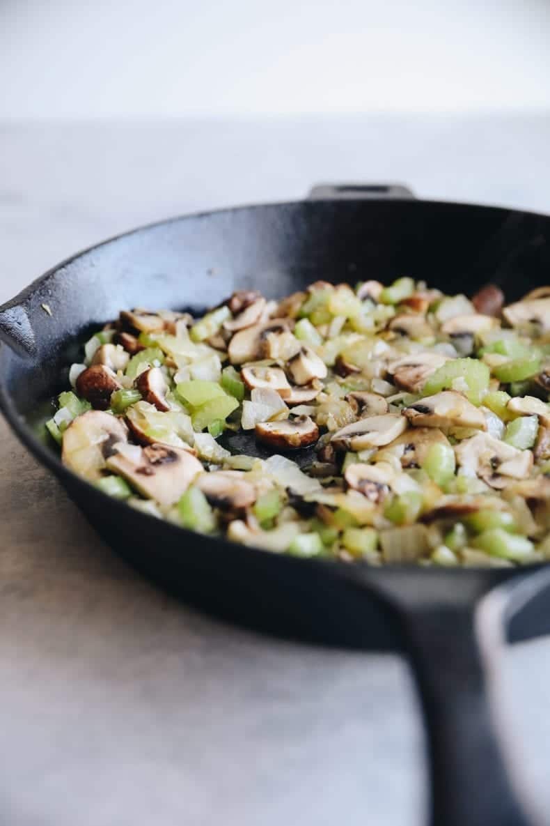 This cauliflower stuffing is jam-packed with veggies! Similar to traditional stuffing I’ve included the classics like cauliflower, onion, mushrooms and of course, sage. But making this recipe is actually easier than most stuffing and doesn’t require any oven space! Here’s how to make it:
