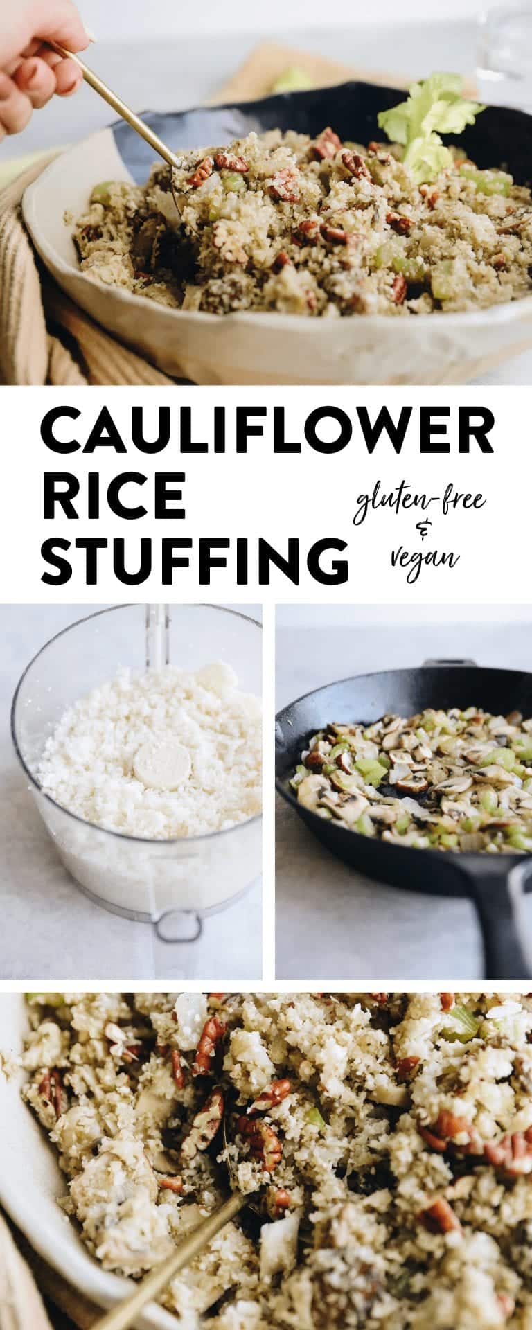 Have you guys ever tried cauliflower rice? It’s gained a lot of popularity in the past few years and for good reason – it’s delicious! Cauliflower rice is essentially as it sounds, “rice” made from cauliflower. Basically, cauliflower is cut into florets and places in a food processor to be processed into a grain-like consistency. It surprisingly has a pretty rice-like shape and is a great substitute for rice, grains or even bread like in this cauliflower stuffing. The process of making it is simple. All you need is: