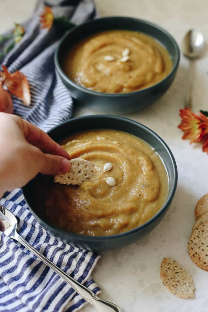Yes! This acorn squash soup uses vegetable broth which makes it entirely vegan and dairy-free.