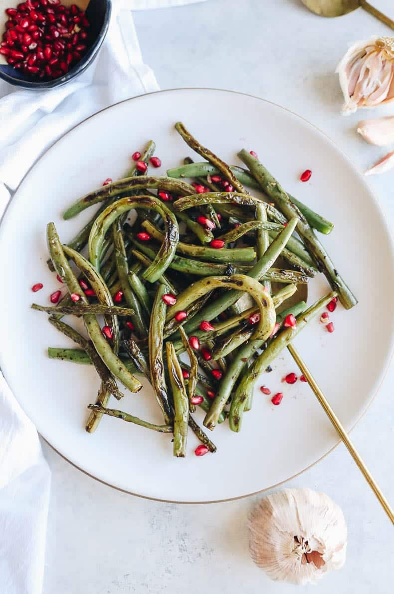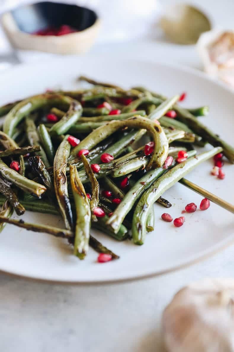 The roasted flavour of the green beans with the pop of sweetness from the pomegranates will make these charred green beans with garlic and pomegranate seeds your new favorite!Â