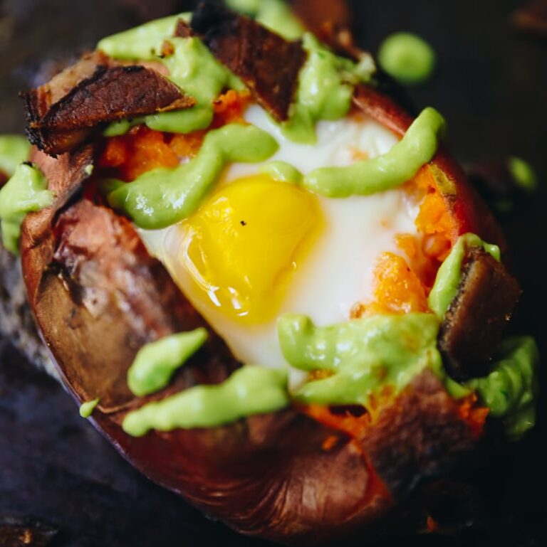 Sweet Potato Egg Boats with Avocado Crema and Bacon