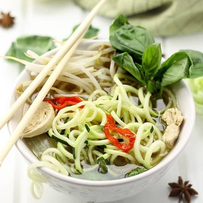 Homemade Vietnamese Pho soup that’s been healthified with zucchini noodles and packed-full of veggies. Don’t be intimidated, this Healthy Chicken Pho with Zucchini Noodles is a lot easier than you think!