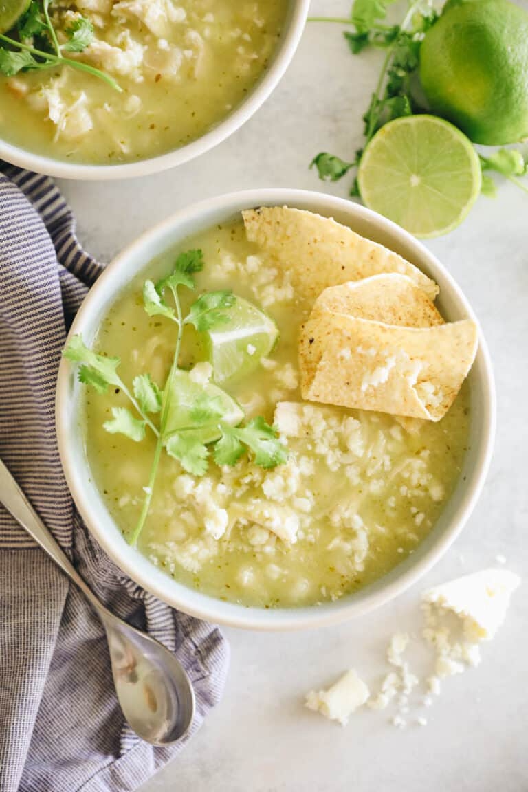 This chicken pozole is a take on traditional Mexican stew with a tangy twist. Featuring white hominy, tomatillos, cilantro and green chiles this pozole verde makes for a delicious weeknight soup or weekend delight.
