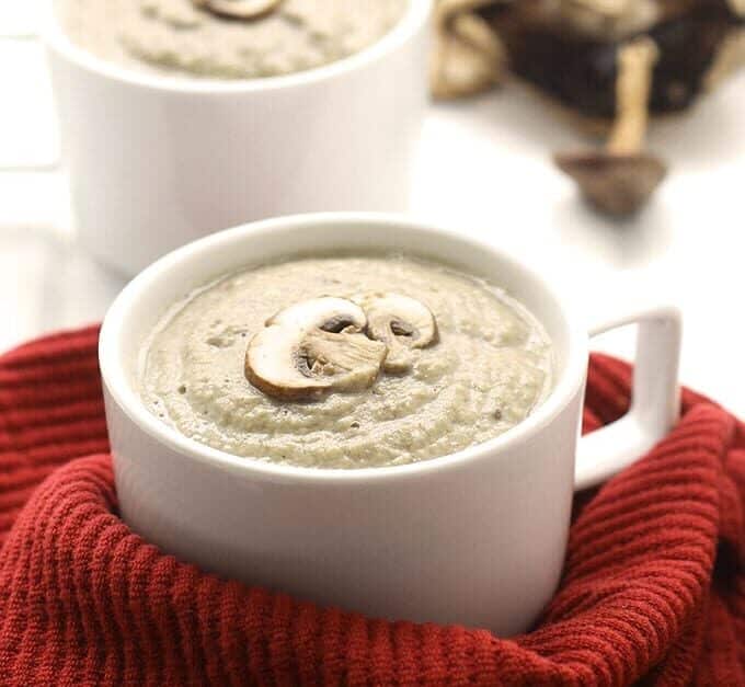 Replace dairy with soaked and blended chickpeas for this hearty and creamy dairy-free “cream” of mushroom soup recipe.