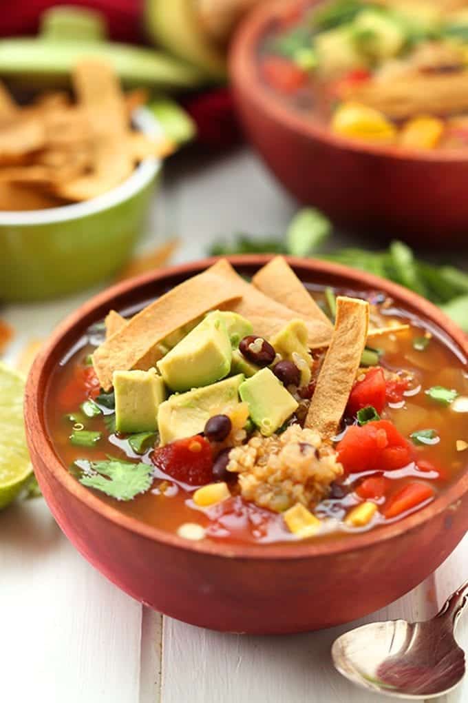 Swap the chicken for quinoa in this healthy Vegetarian Tortilla Soup Recipe! Quinoa is high in fiber and protein and makes a great non-meat alternative in this spicy Mexican soup.
