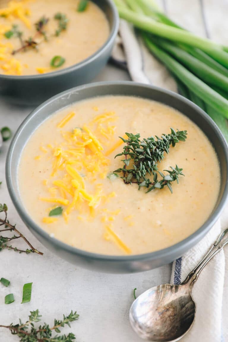 This creamy roasted cauliflower soup is packed full of delicious flavor and a healthy serving of veggies! Cauliflower is roasted to perfection, blended with garlic and herbs and mixed together with savory sharp cheddar cheese. Perfect for those cold winter nights!