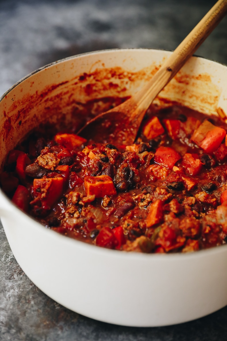 STEP 5: Lower heat to a simmer and cook for 30-40 minutes or until a desired consistency is reached. Be sure to stir often. The longer you cook it, the thicker your turkey sweet potato chili will be!